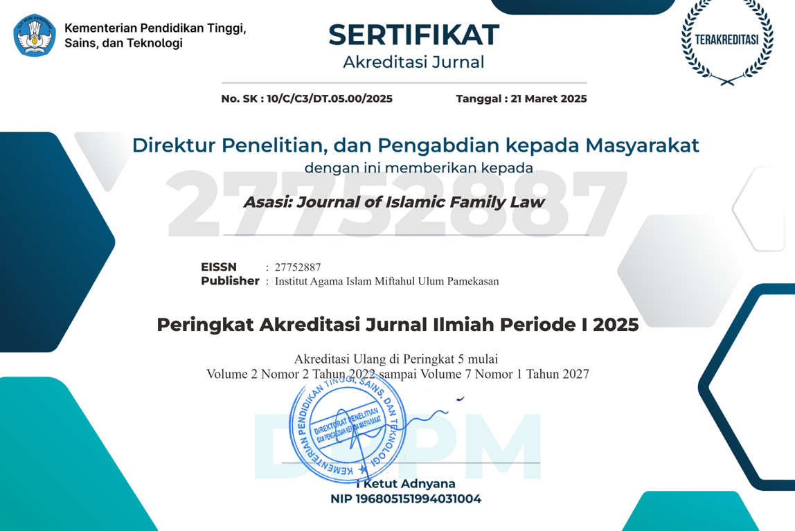 Asasi: Journal of Islamic Family Law is a peer-reviewed academic journal dedicated to advancing scholarly discourse in the field of Islamic Family Law. The journal focuses on publishing original research articles that critically examine classical and contemporary issues within Islamic legal traditions, particularly in the areas of marriage, divorce, inheritance, guardianship, gender justice, and child protection.